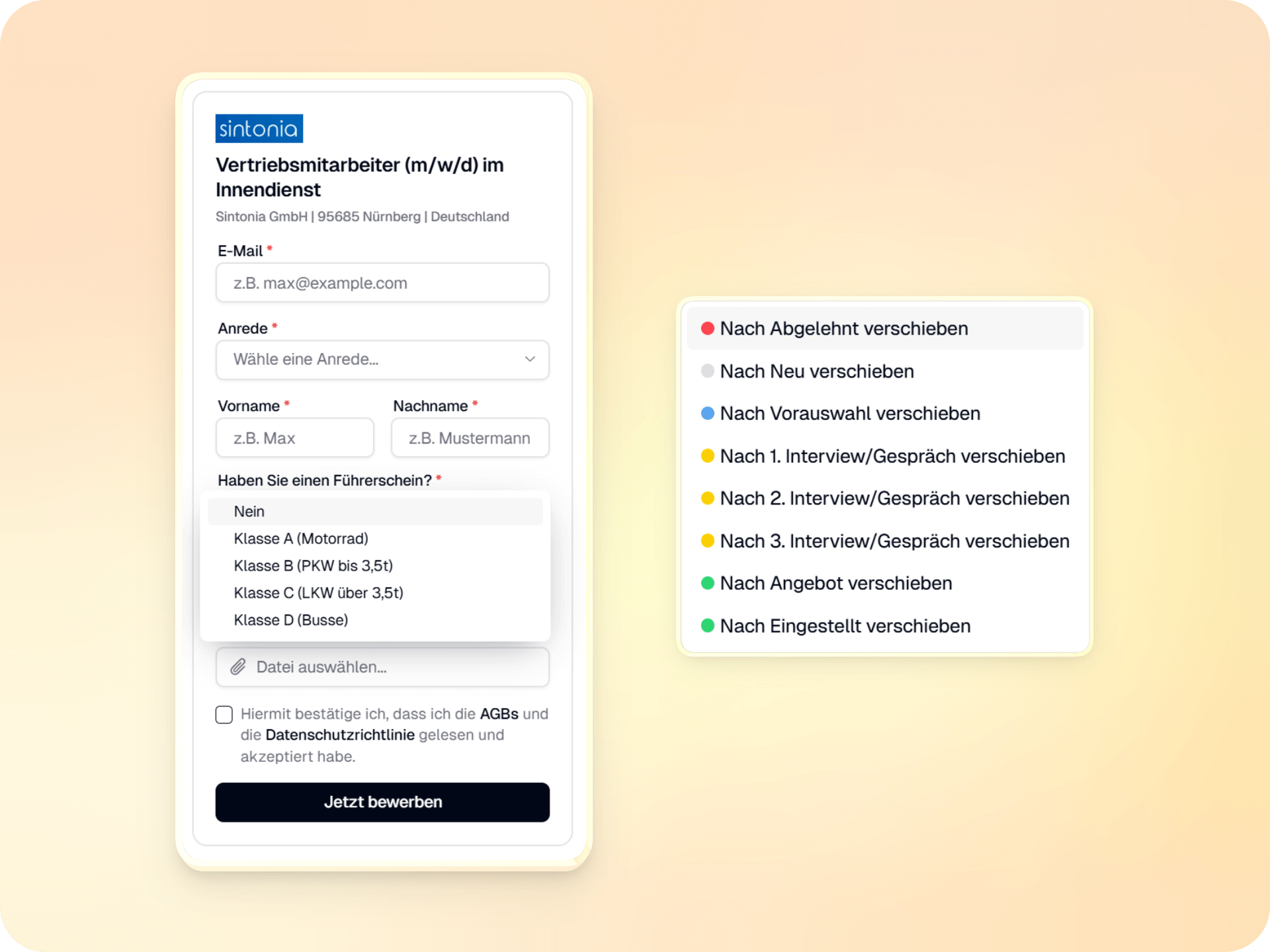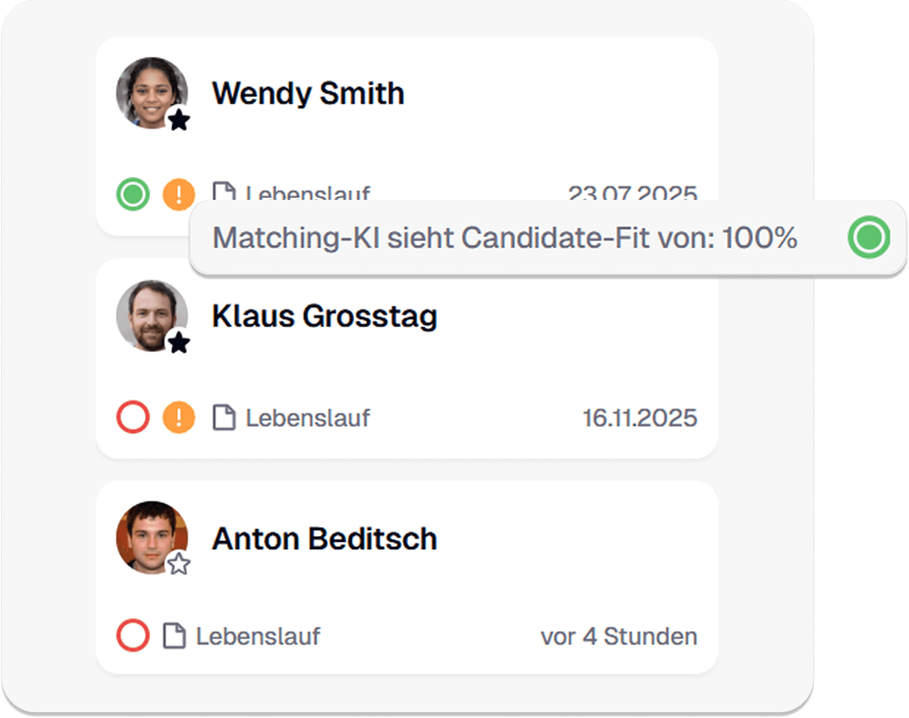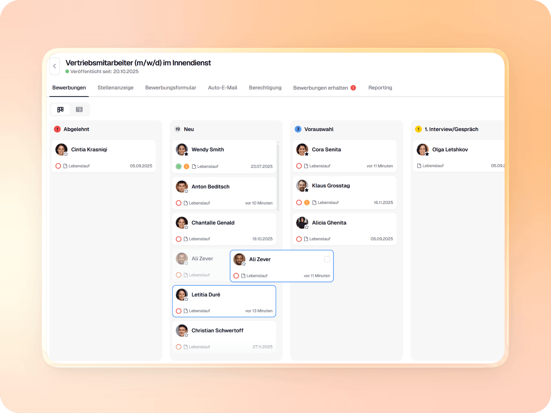 Schluss mit unübersichtlichen Listen. In unserer visuellen Recruiting-Pipeline managen Sie Kandidaten intuitiv per Drag-and-Drop. Sehen Sie auf einen Blick, welche Talente neu eingegangen sind und wer sich gerade in welcher Phase befindet.