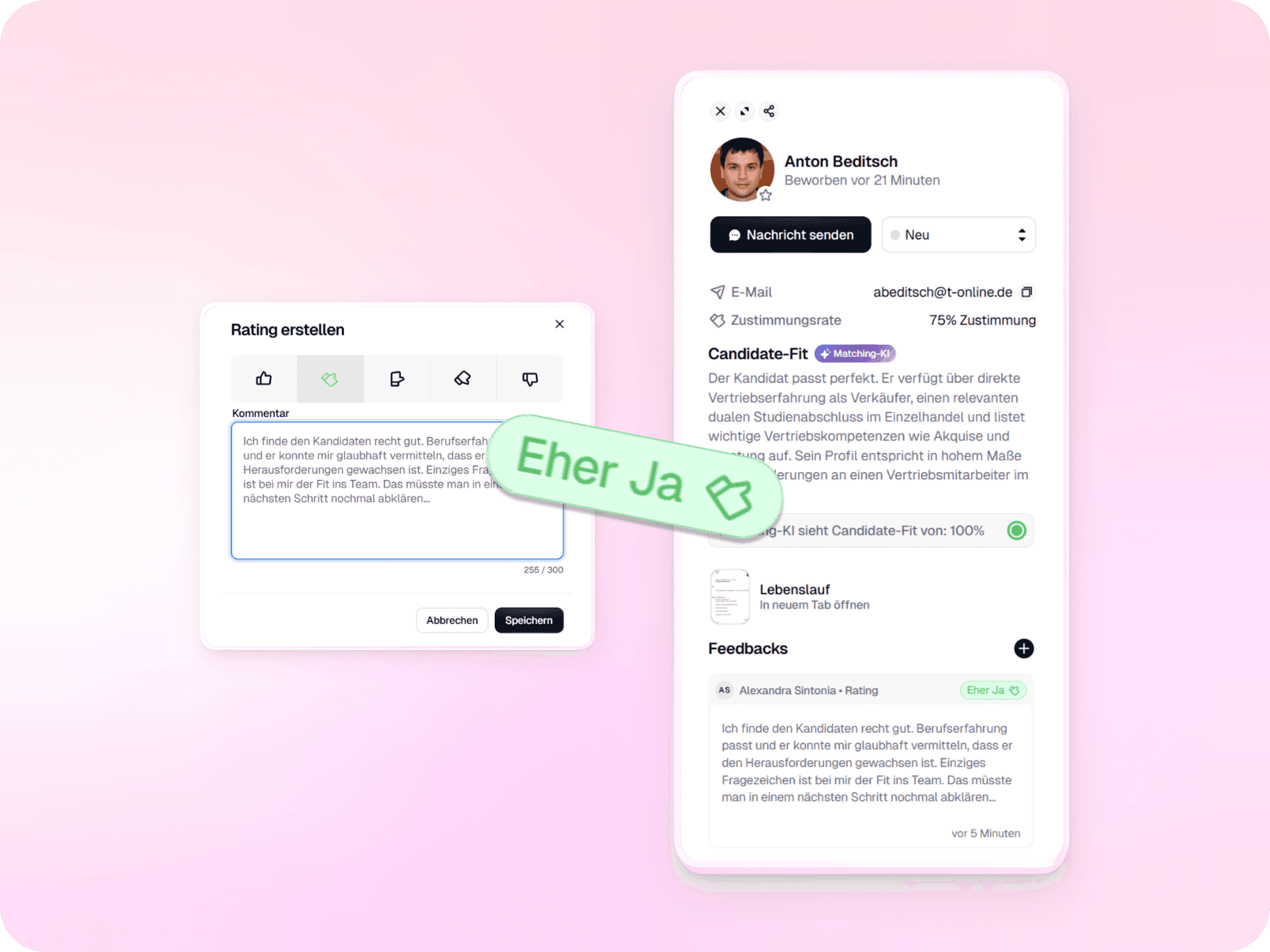 Bewerten Sie Talente gemeinsam im Team. Unser System bündelt alle Feedbacks an einem Ort für objektive und schnelle Personalentscheidungen.