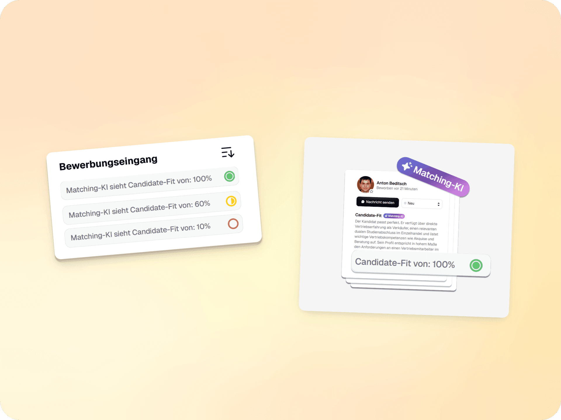 Qualität im Recruiting messbar machen: Die Machting-KI unserer Bewerbermanagement-Software gleicht direkt die übermittelten Informationen einer Bewerbung mit den Anforderungen der Stelle ab und ermittelt einen Candidate-Fit-Score.