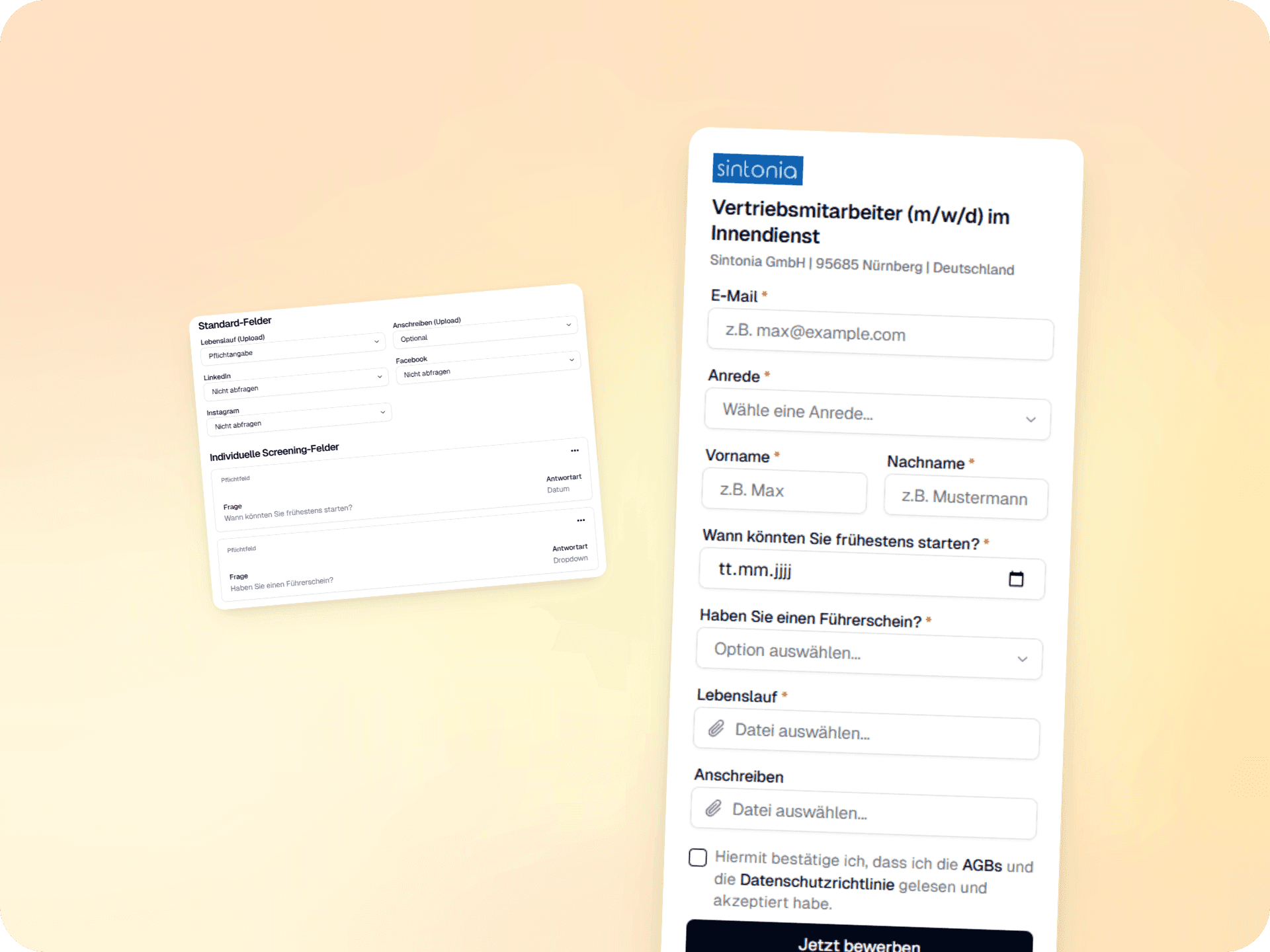 Bewerbungsformular statt E-Mails: Kandidaten bewerben sich über ein kurzes Formular, das Sie gestalten. Schneller & sicherer für den Kandidaten, effizienter für Sie.