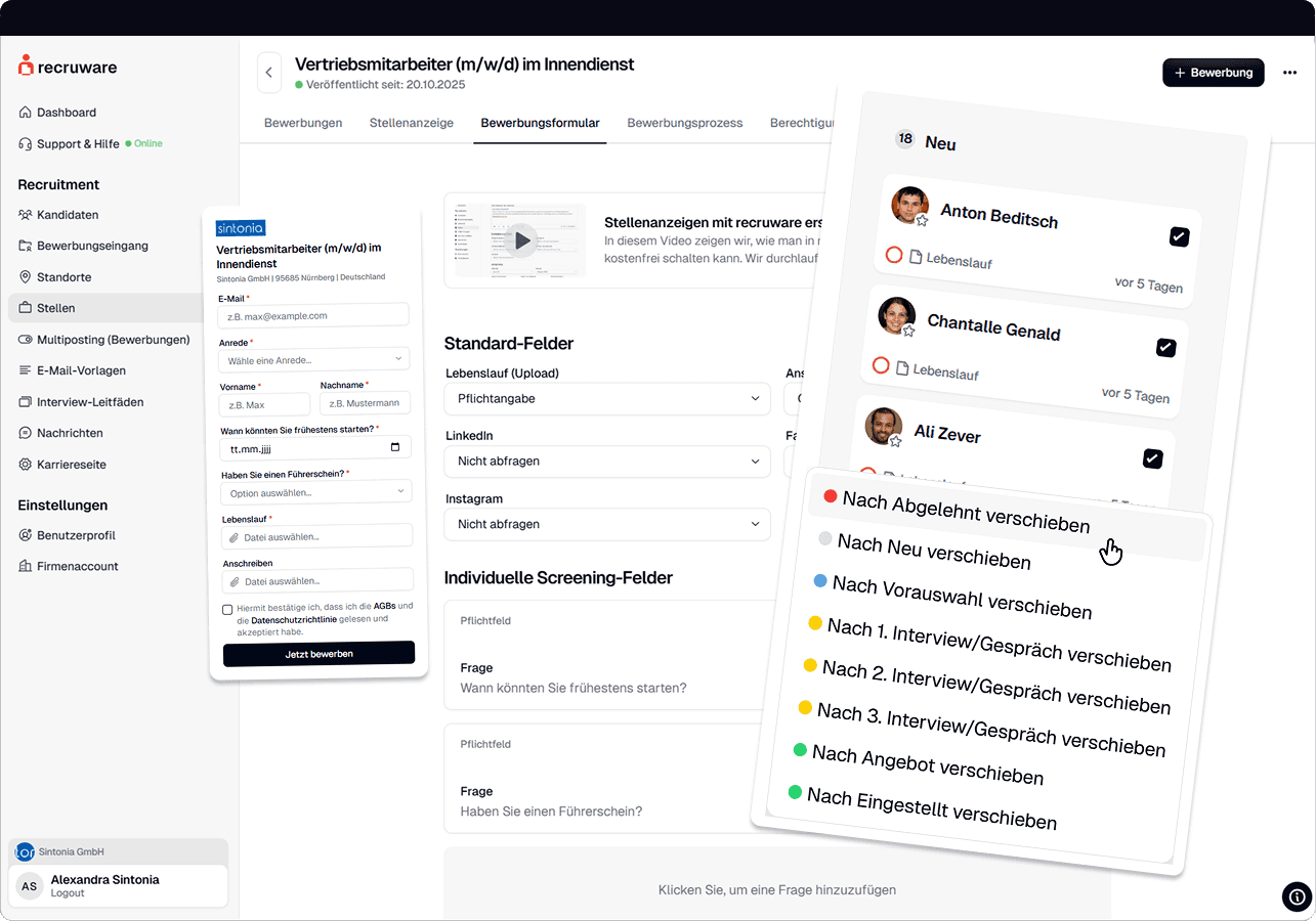 Der Schlüssel zu einem effizienten Auswahlprozess liegt in einem strukturierten und einheitlichen Bewerbungseingang sowie den richtigen Fragen direkt bei der Bewerbung. Beides definieren Sie bei recruware direkt bei der Anzeigenerstellung: