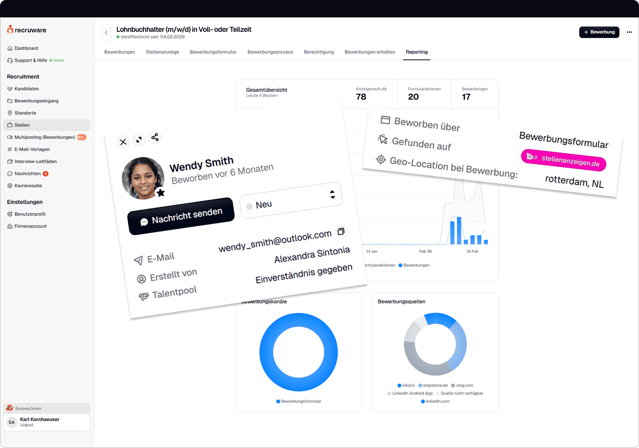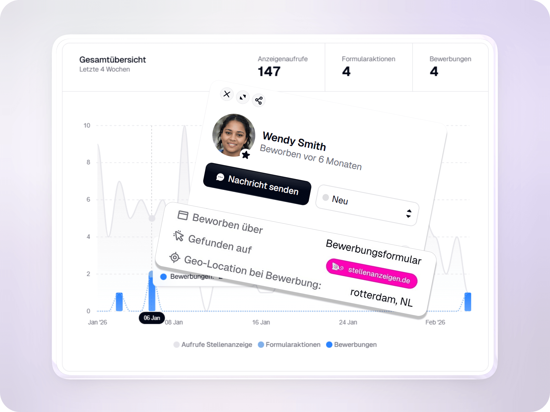 Geben Sie Ihr Budget dort aus, wo es den höchsten ROI erzielt. Unsere automatische Channel-Performance-Analyse bietet Ihnen eine lückenlose Quellenanalyse Ihrer Bewerbungen.