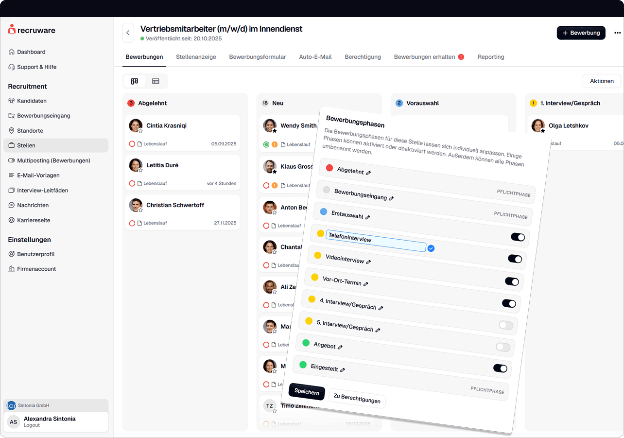 Das Herzstück Ihres Bewerbermanagements. Verschieben Sie Kandidaten per Mausklick von einer Phase in die nächste. Jede Änderung des Bewerberstatus wird sofort systemweit aktualisiert – so ist Ihr gesamtes Team immer auf dem neuesten Stand.