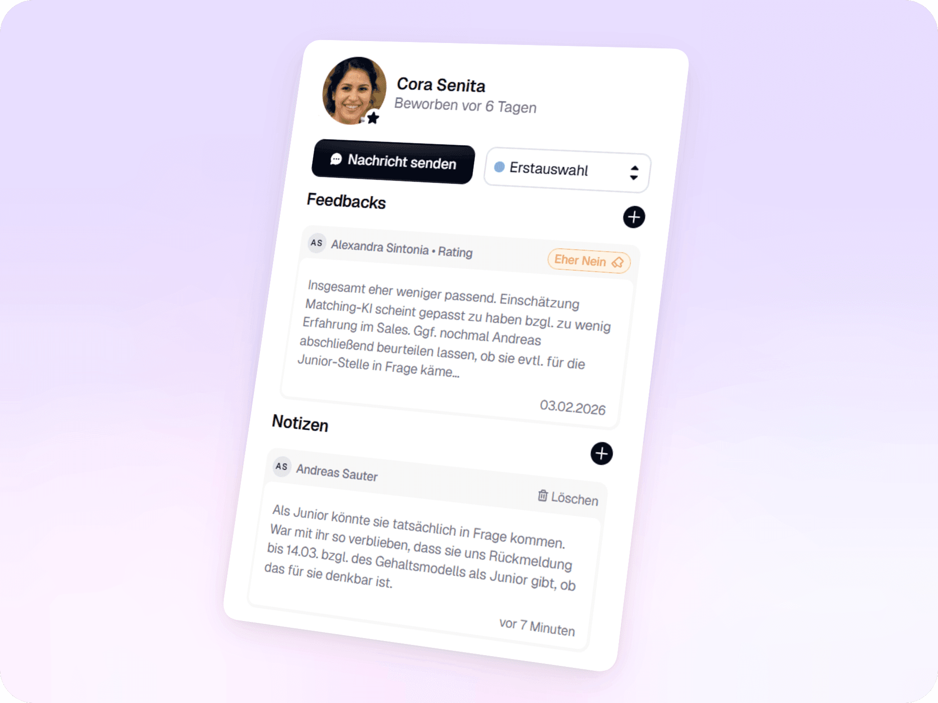 Nach dem Termin können alle Beteiligten ihr Interview-Feedback und ihre Bewertung (1-5 Sterne) sofort im System hinterlegen. Diese digitalen Gesprächsprotokolle sind die perfekte Basis für die finale Entscheidung im Team und machen den Prozess für alle Beteiligten transparent.